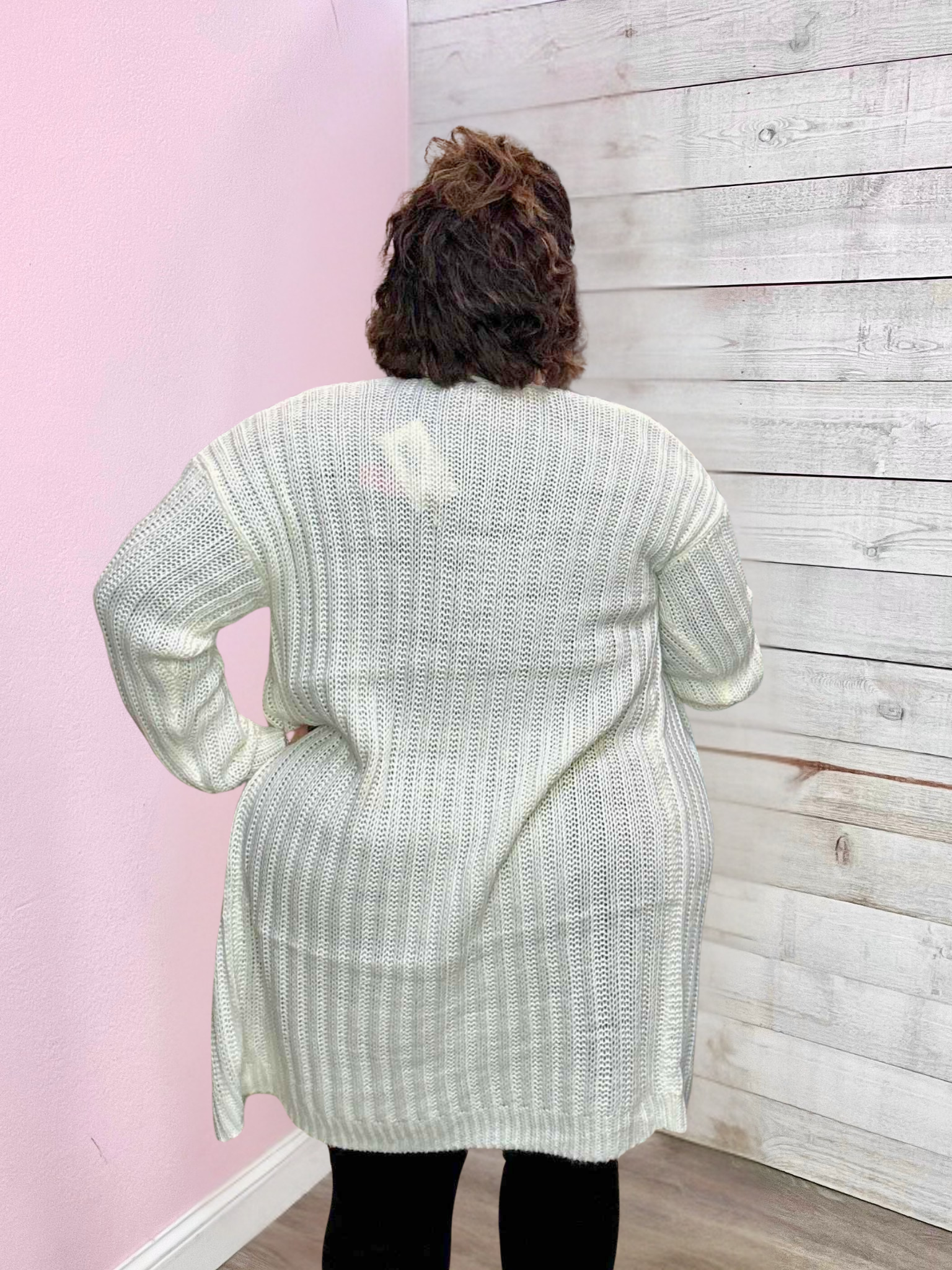 Ivory sweater cardigan featuring an open front, long sleeves, and a straight hemline.