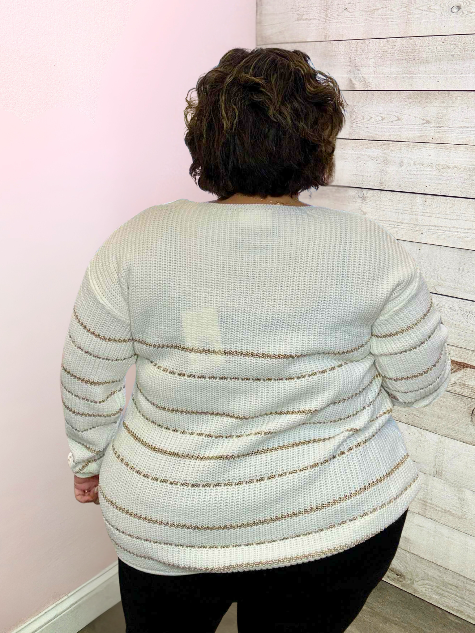 Ivory sweater with gold stripes featuring a V neckline, long sleeves, and a straight hemline.