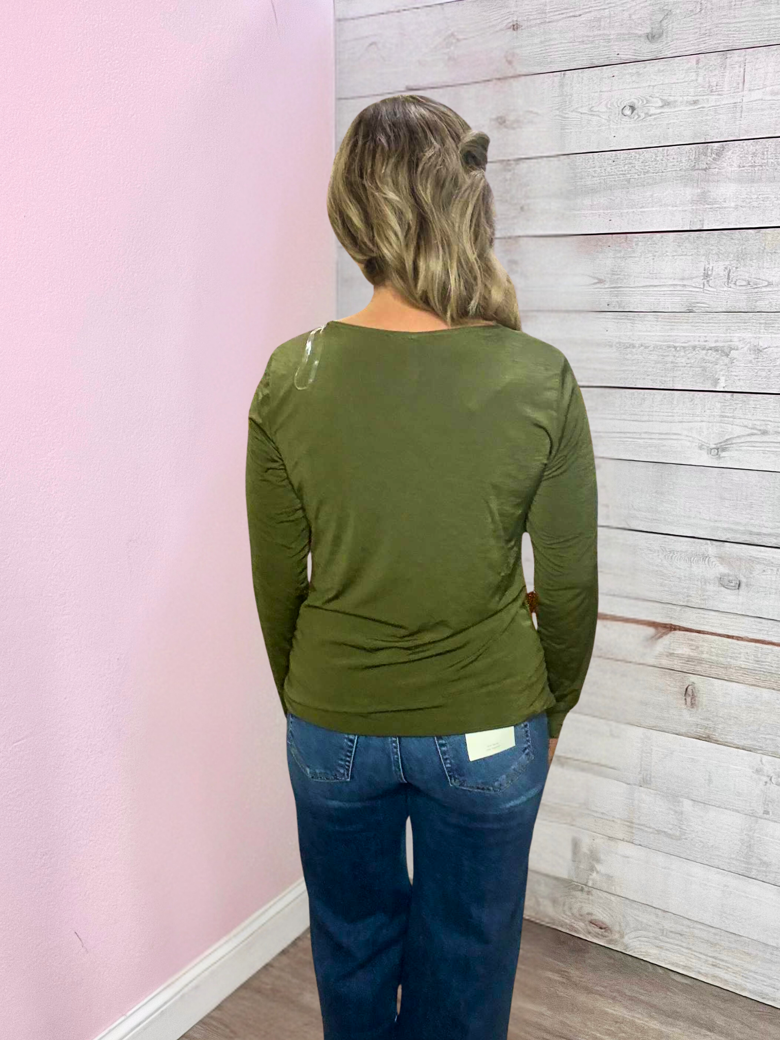 Beautiful, solid ruched blouse with a drop neckline, long sleeves, and a straight hemline. Wrinkle-free material. Stretchy, non-sheer.