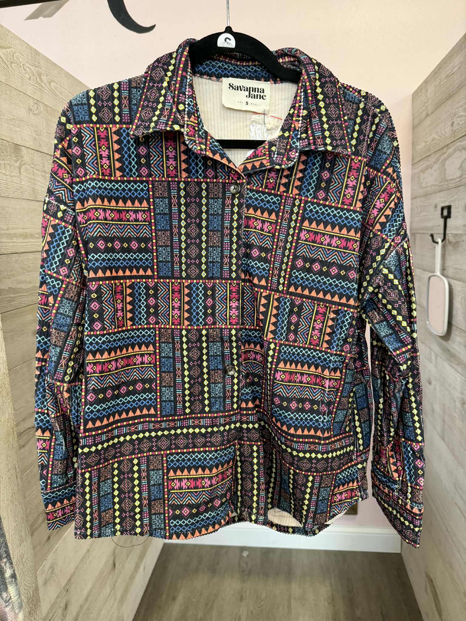 Multicolor Aztec print jacket featuring a collared neckline, button down front, long sleeves with button cuffs, side pockets, and a curved hemline. Ribbed texture.