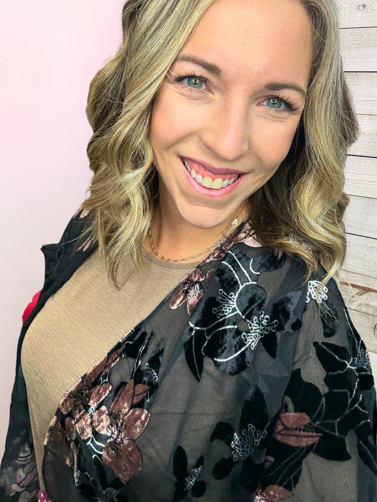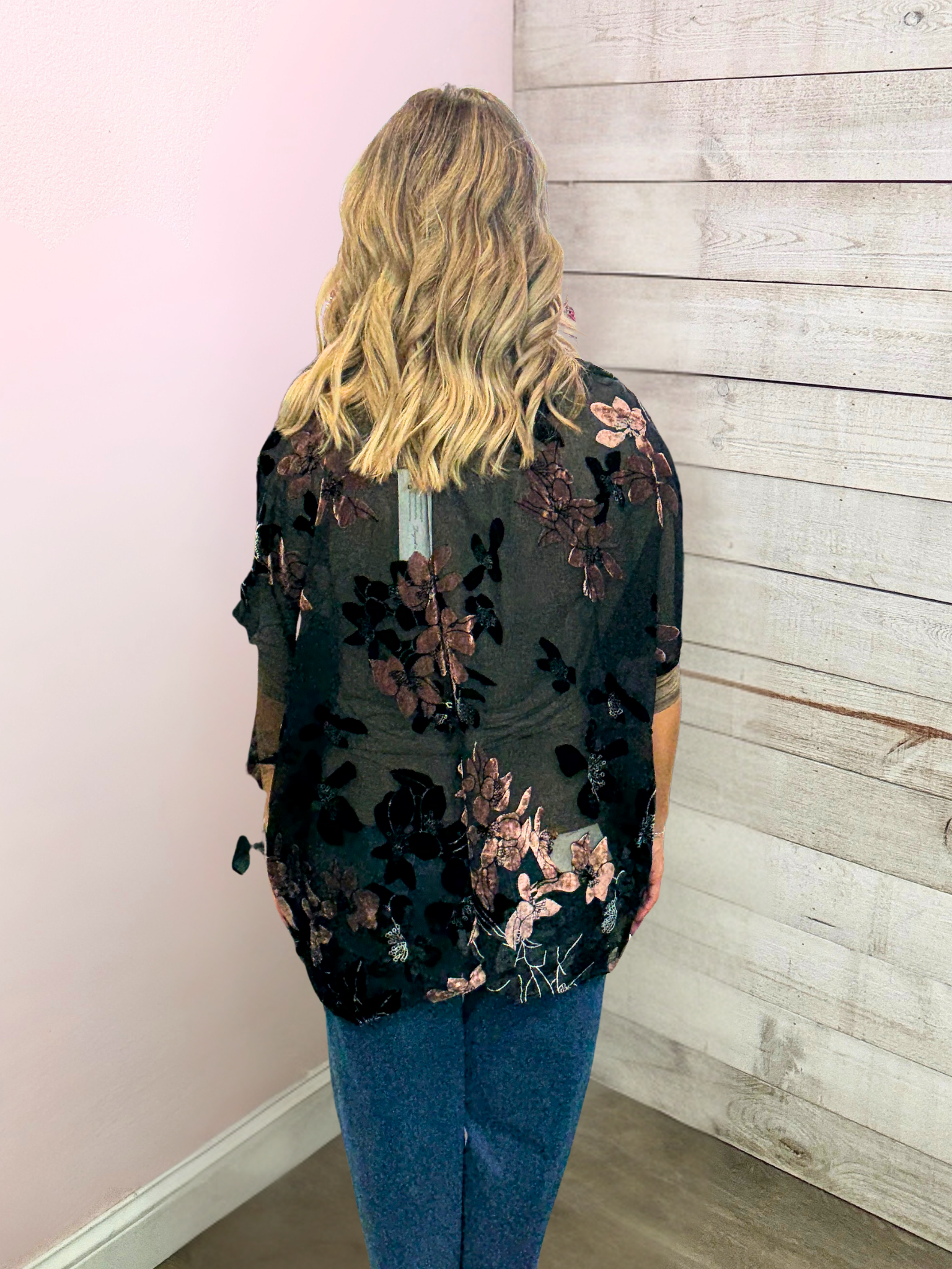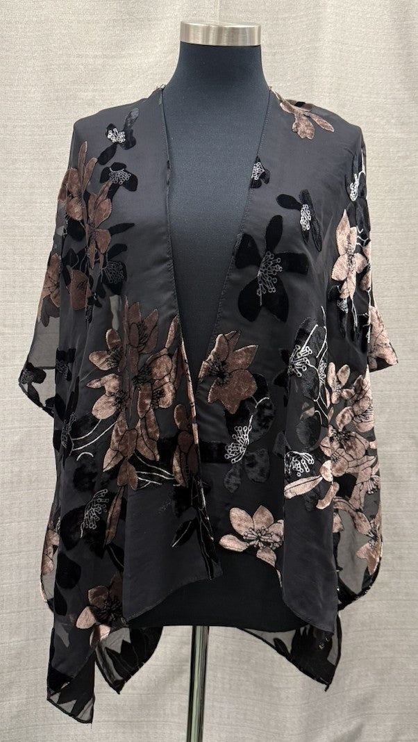 Elegant sheer kimono with a velvet floral print. Hip Length.