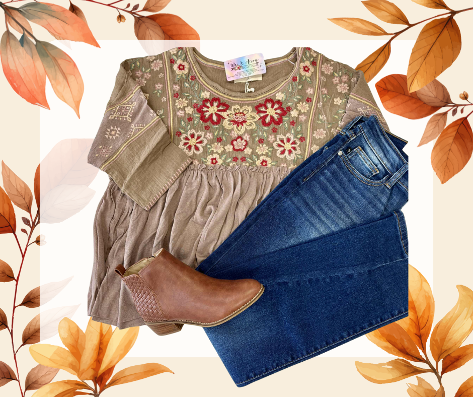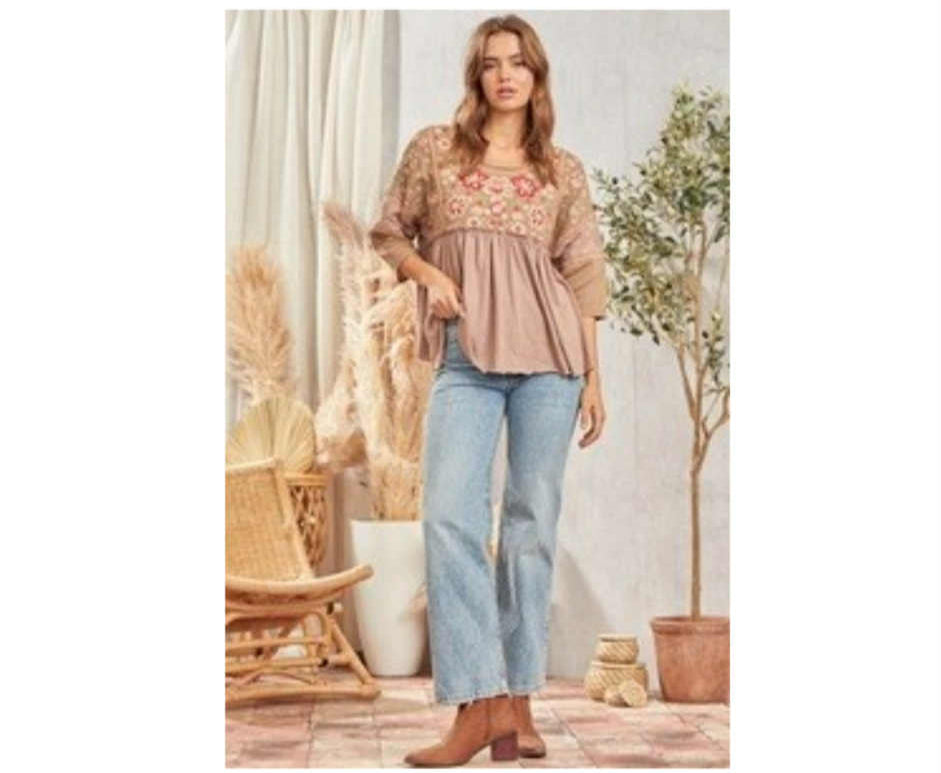 Mocha babydoll top with an embroidered floral print on the top half. Featuring a round neckline, three-quarter sleeve, and a flowy hemline.