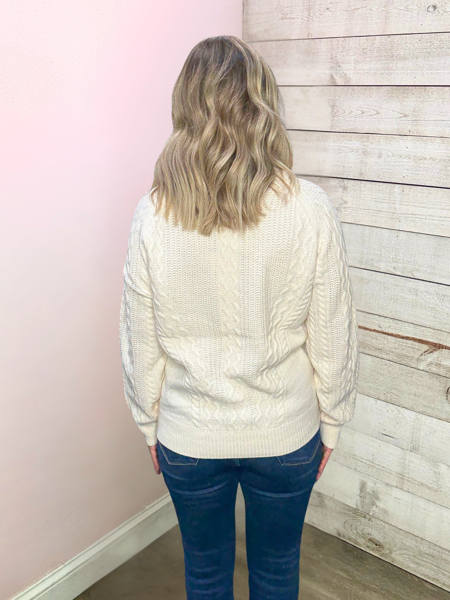 Ivory cable knit sweater with buttons featuring a crew neckline, long sleeves, and a straight hemline.