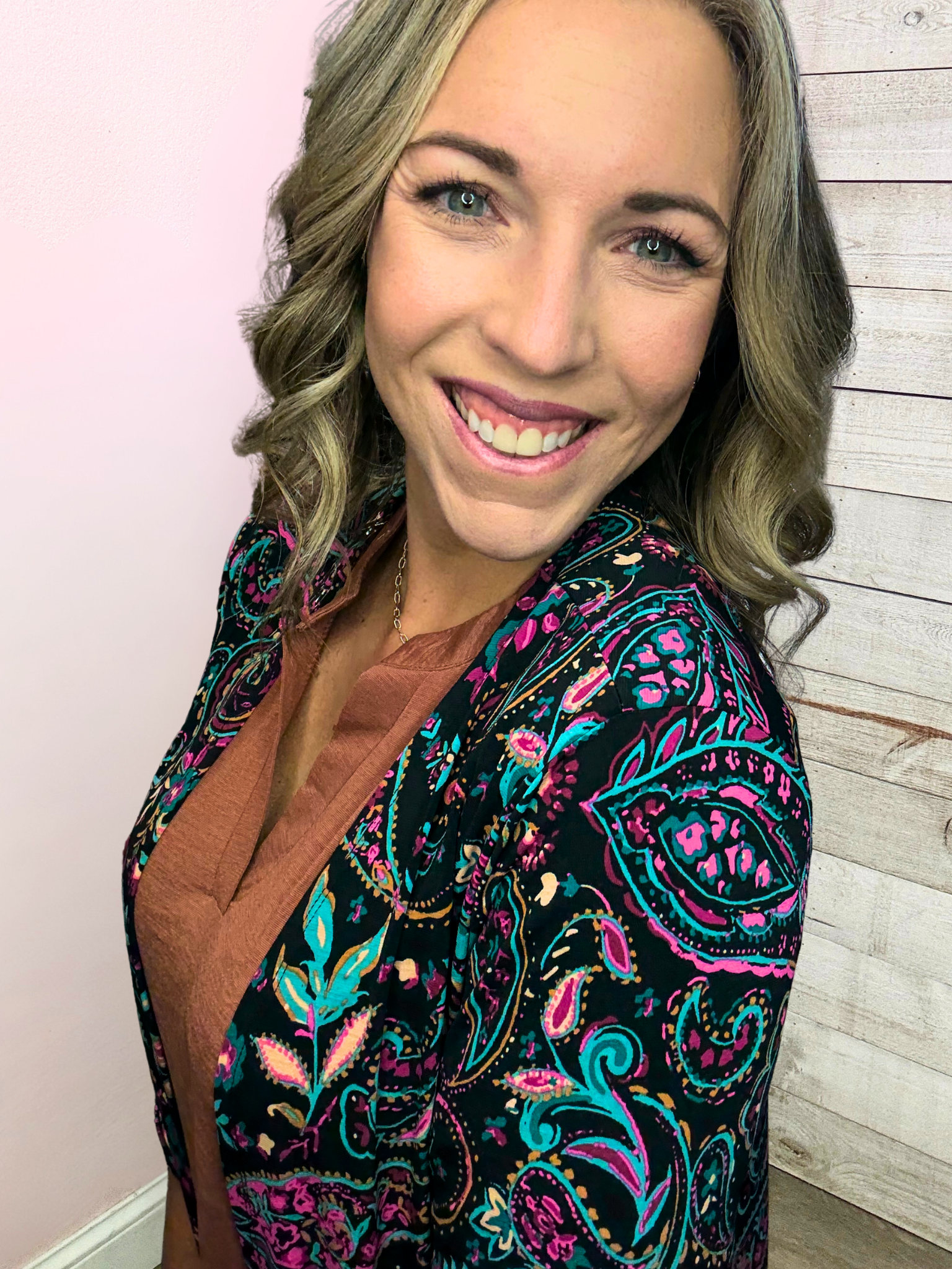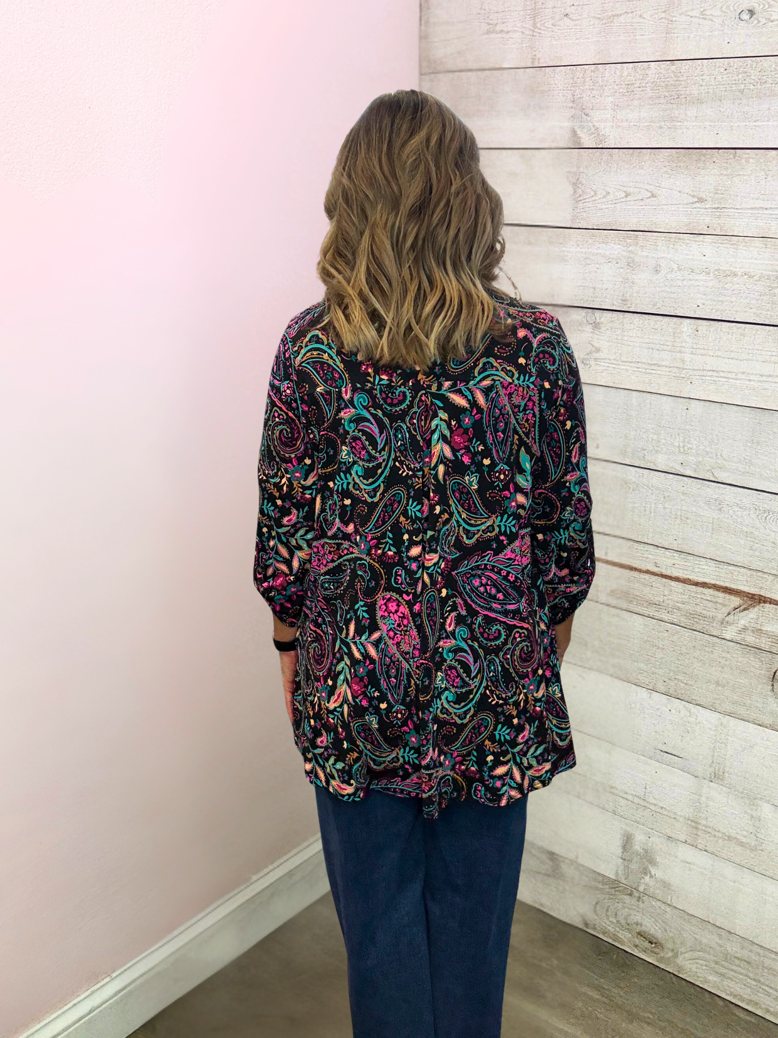 Black Lizzy cardigan with a pink and mint paisley print featuring a 3/4 length button sleeve, side pockets, and a straight hemline. True to size!