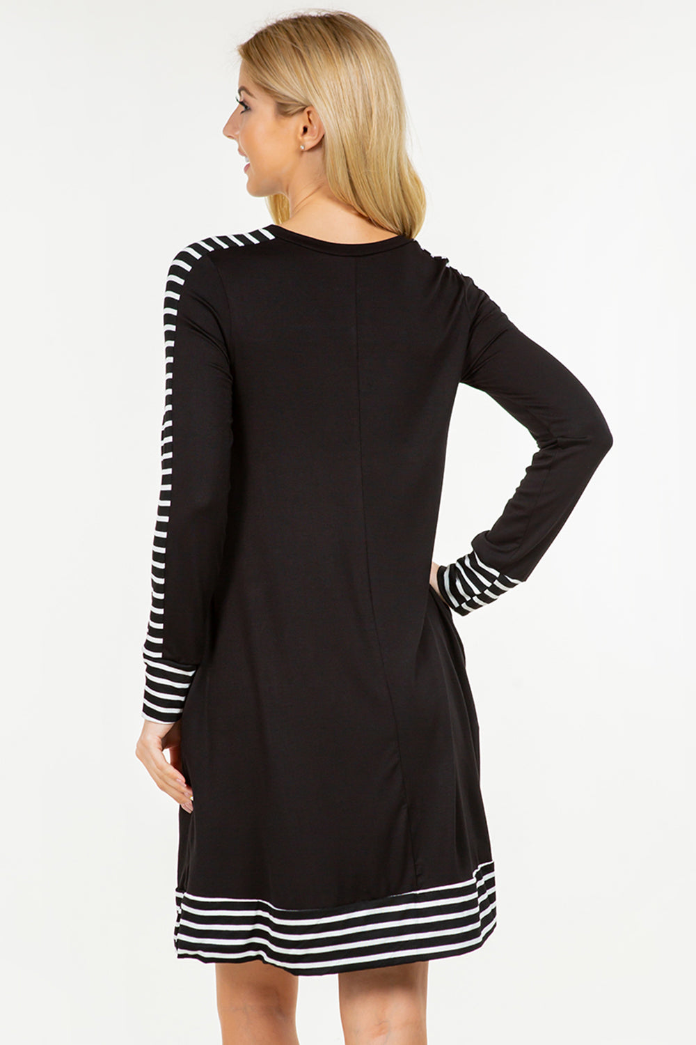 We love this black midi dress. It has pockets and stripe print detail. So fun! You can use this midi dress for all seasons. It has long sleeves, perfect for Fall, Winter, and Spring. As always, match this dress with your favorite accessories to make an effortlessly beautiful outfit.