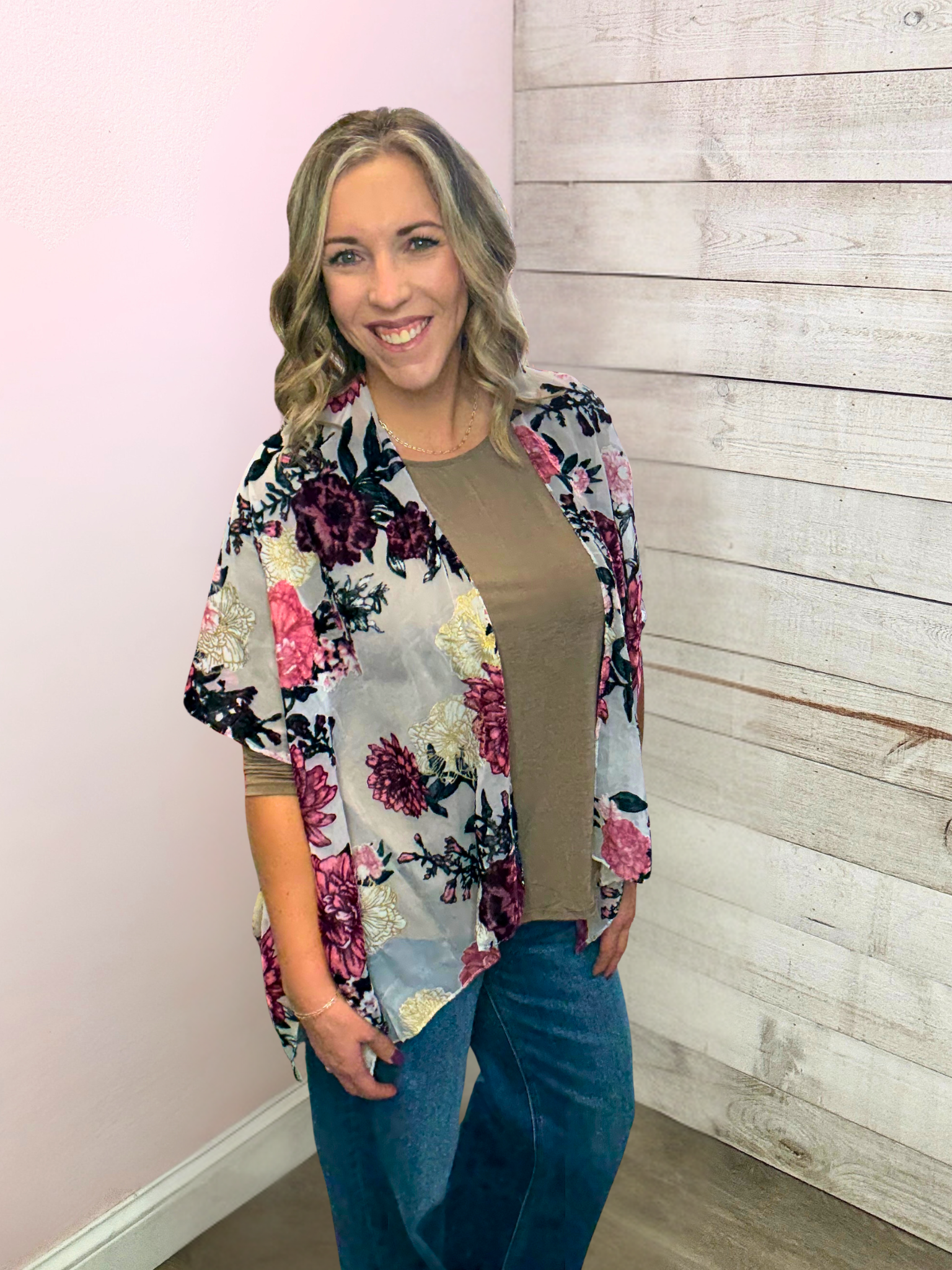Elegant sheer kimono with a velvet floral print. Hip Length.