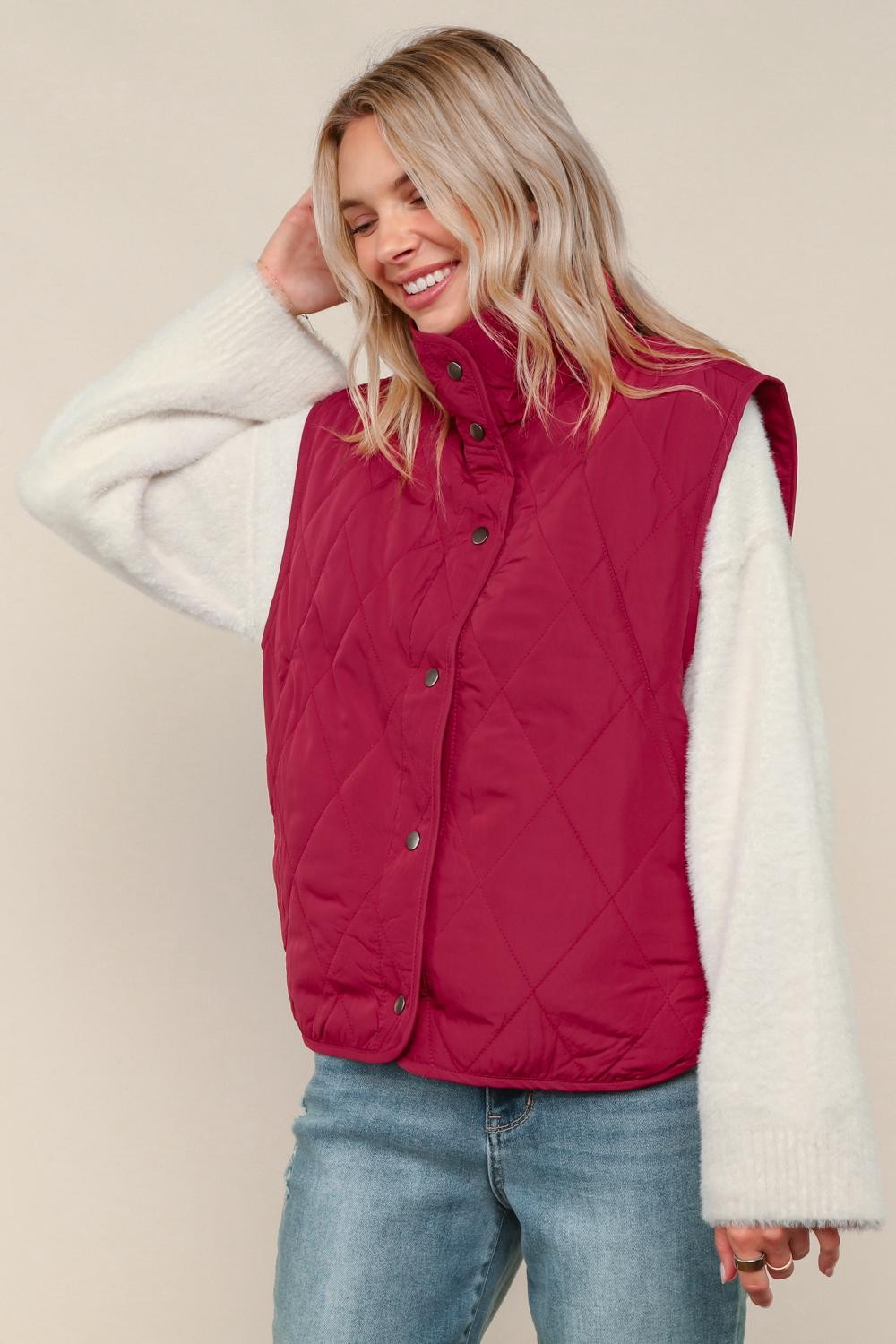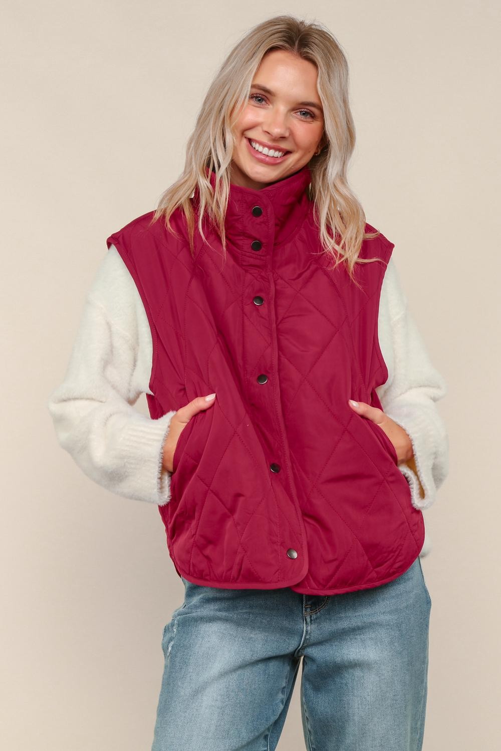 Quilted vest featuring a high neck, snap button down front, side pockets, and dolphin hemline. Fully lined. True to size!