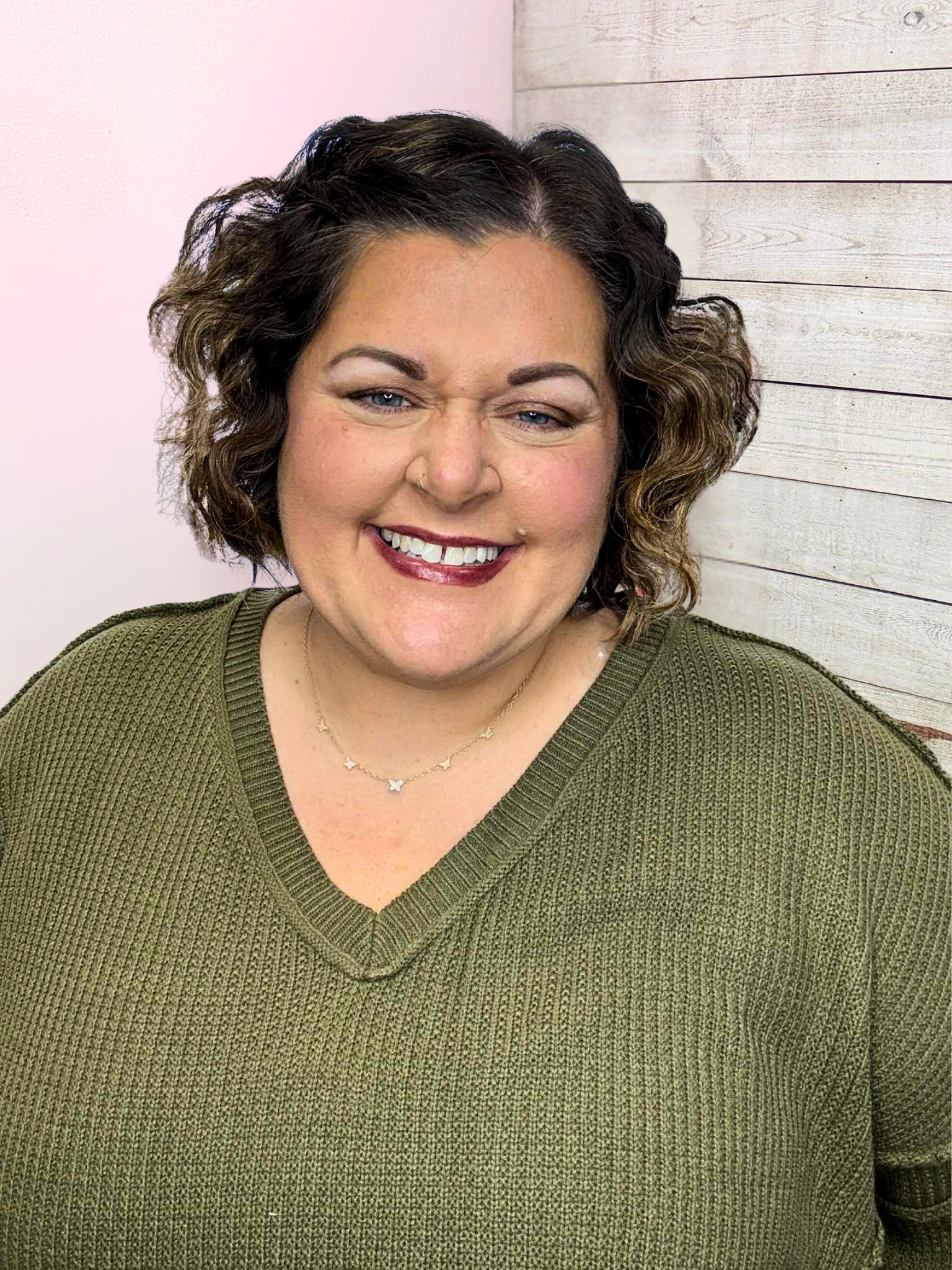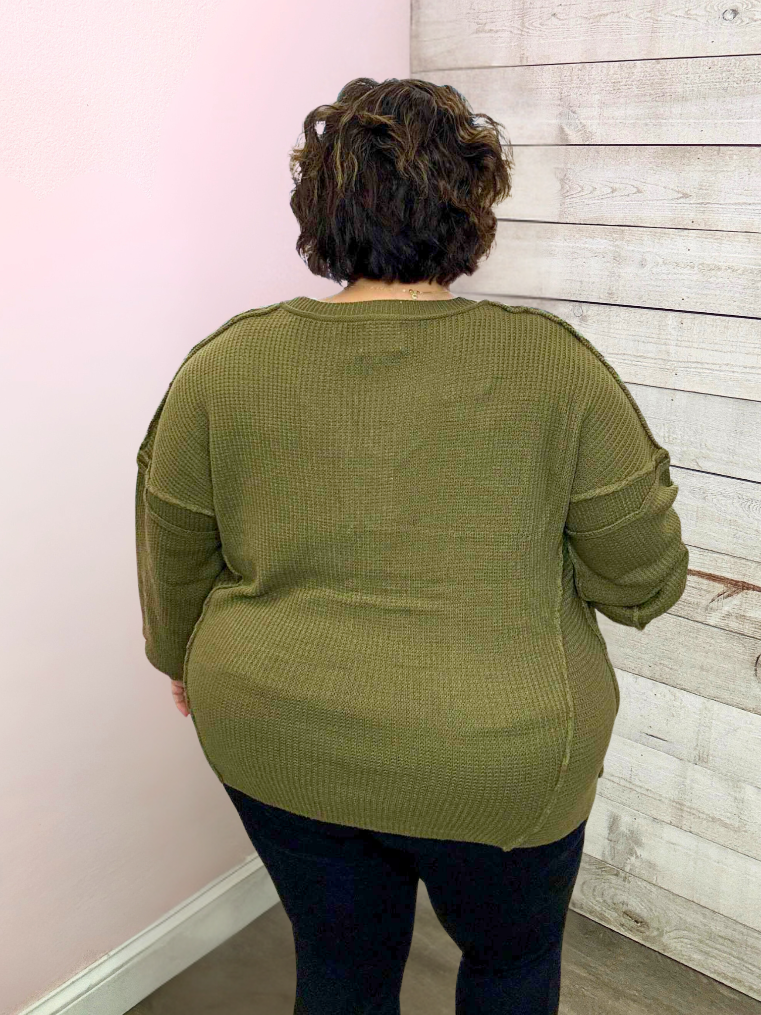 Waffle knit olive sweater featuring a V neckline, long sleeves, exposed stitching, and a curvy hemline.