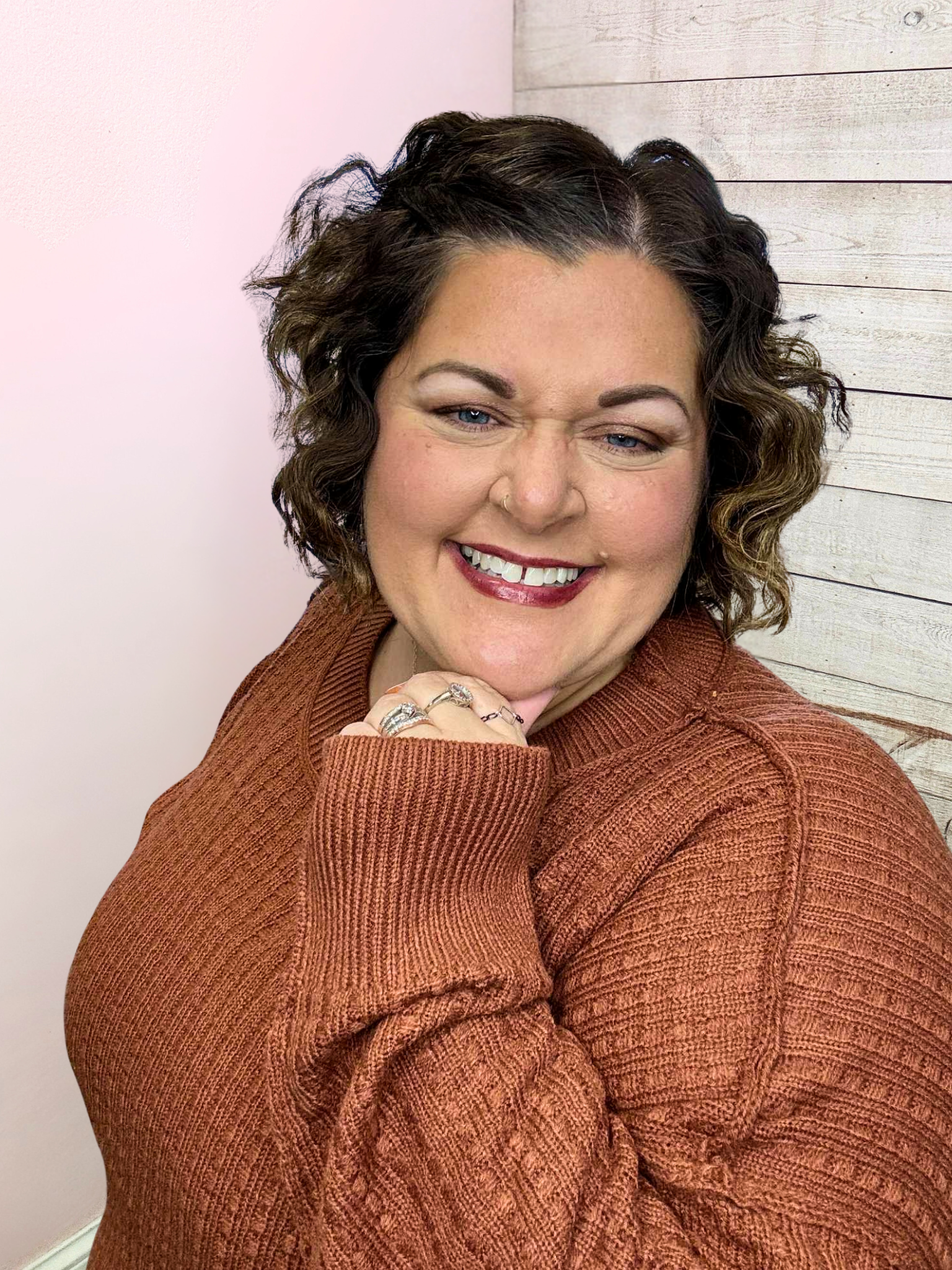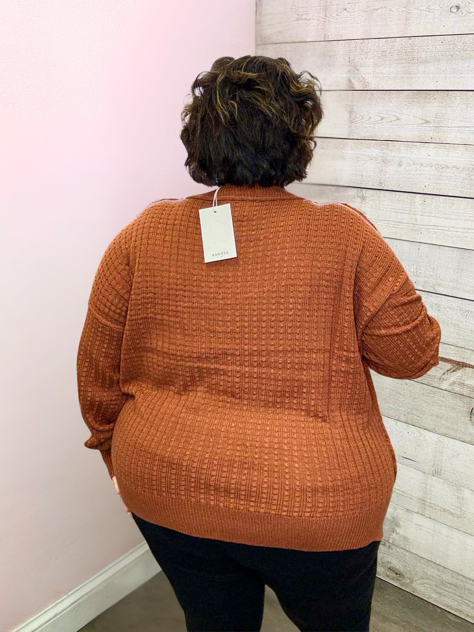Rust textured sweater featuring a crew neckline, long sleeves, and a straight hemline with side slits.