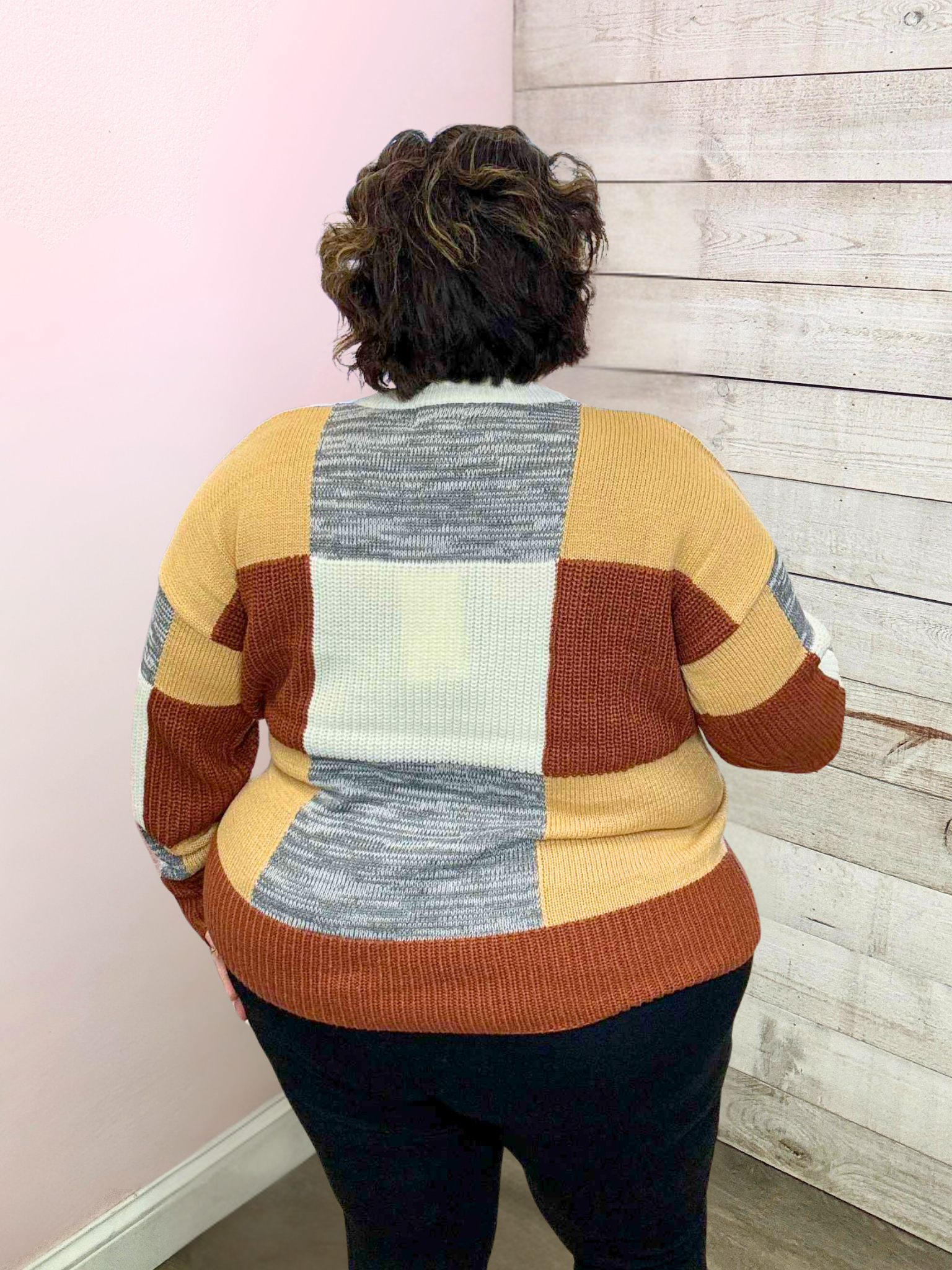 Grey, ivory, rust, and tan square pattern sweater featuring a crew neckline, long sleeves, and a straight hemline.