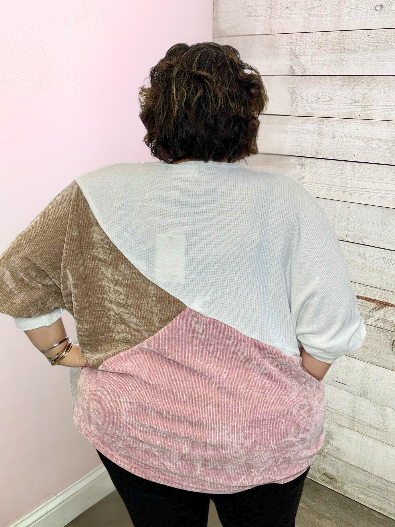 Pink, brown, and white colorblock top featuring a round neckline, long dolman sleeves, and a hi-low curved hemline. Super soft!