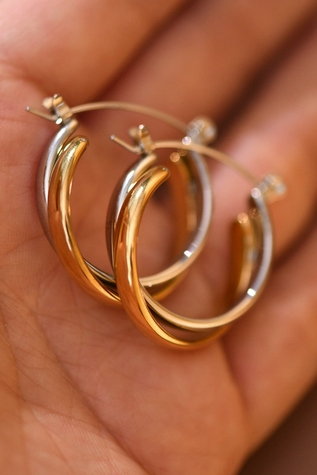 18K gold dipped non-tarnish stainless steel closed hoop earrings in two-tone