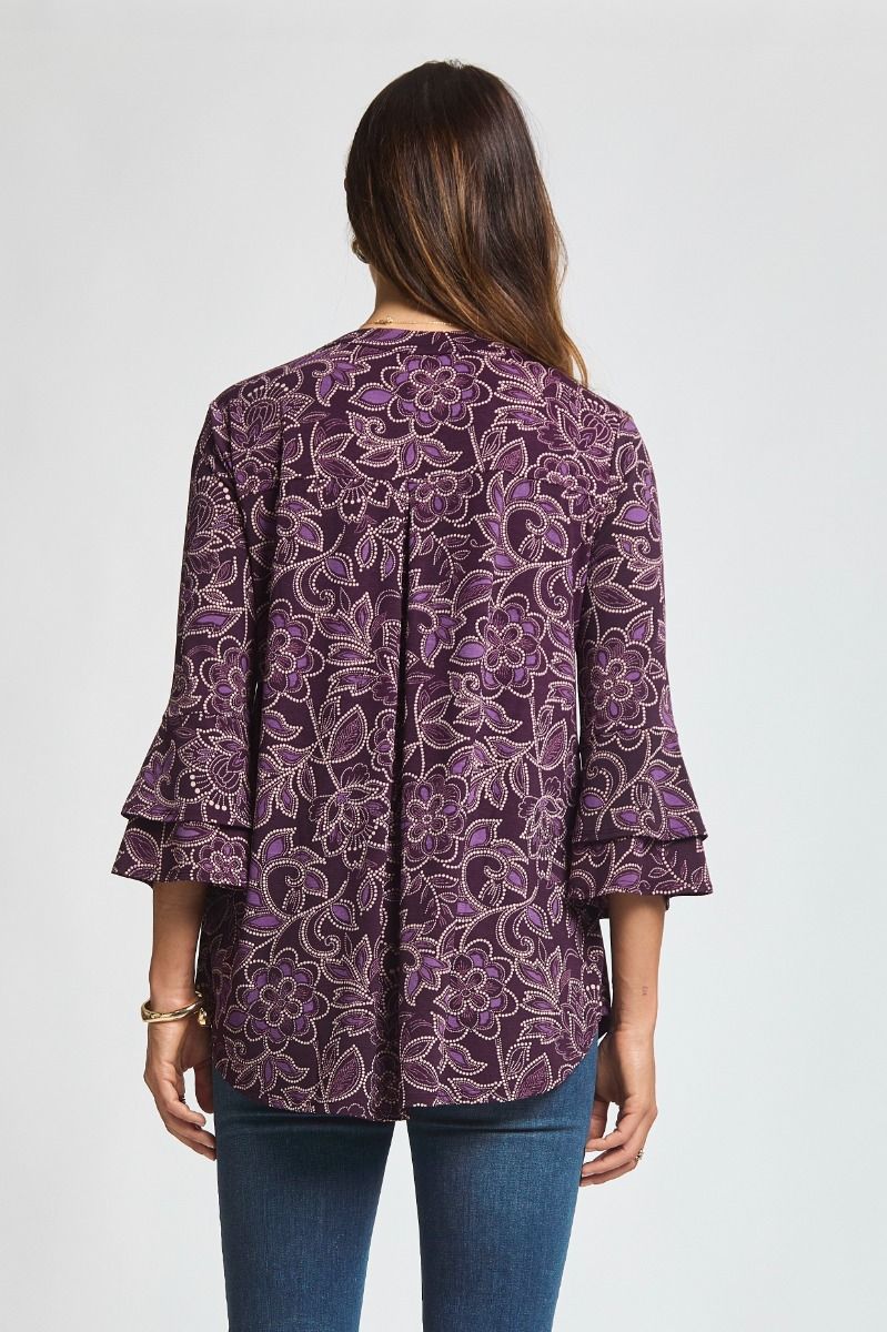 Meet the belled LIZZY! A fresh take on effortless elegance. Designed with a relaxed fit, this versatile top features a refined Lizzy neck and beautifully tiered bell sleeves that add a touch of romantic flair. Purple with a paisley print. True to size.