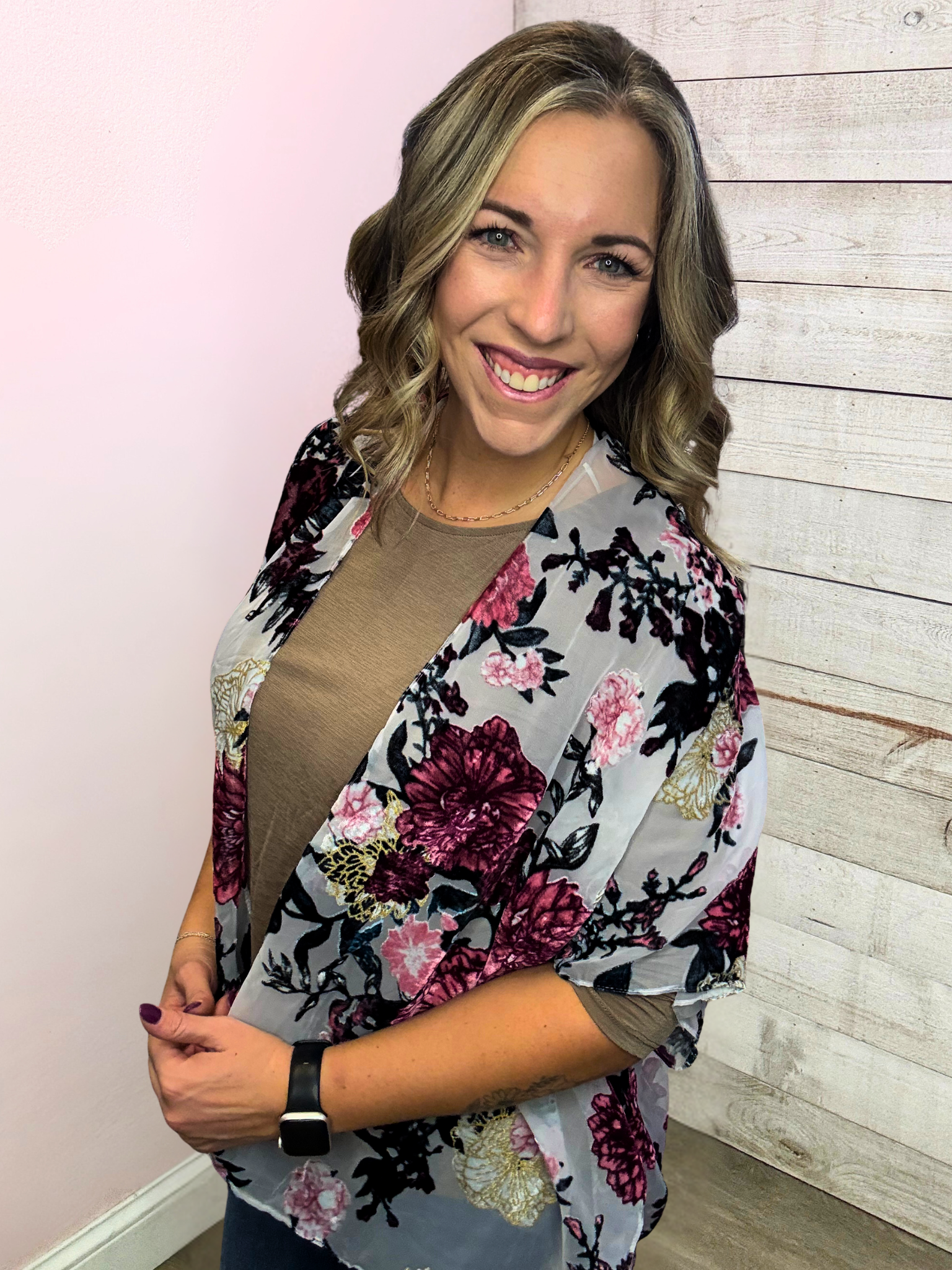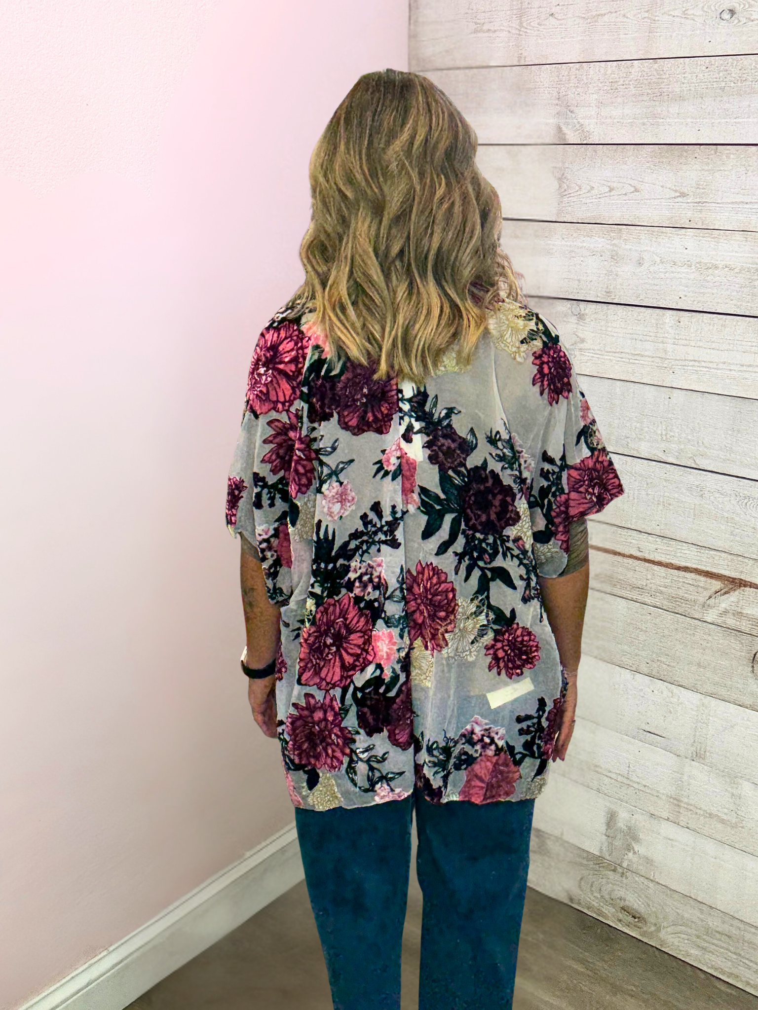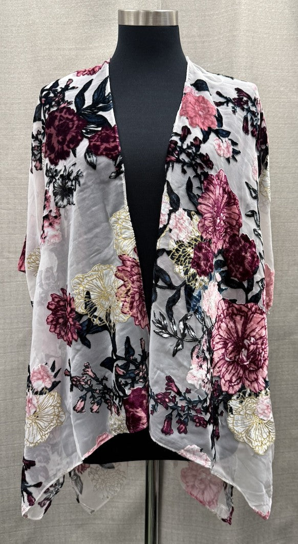 Elegant sheer kimono with a velvet floral print. Hip Length.