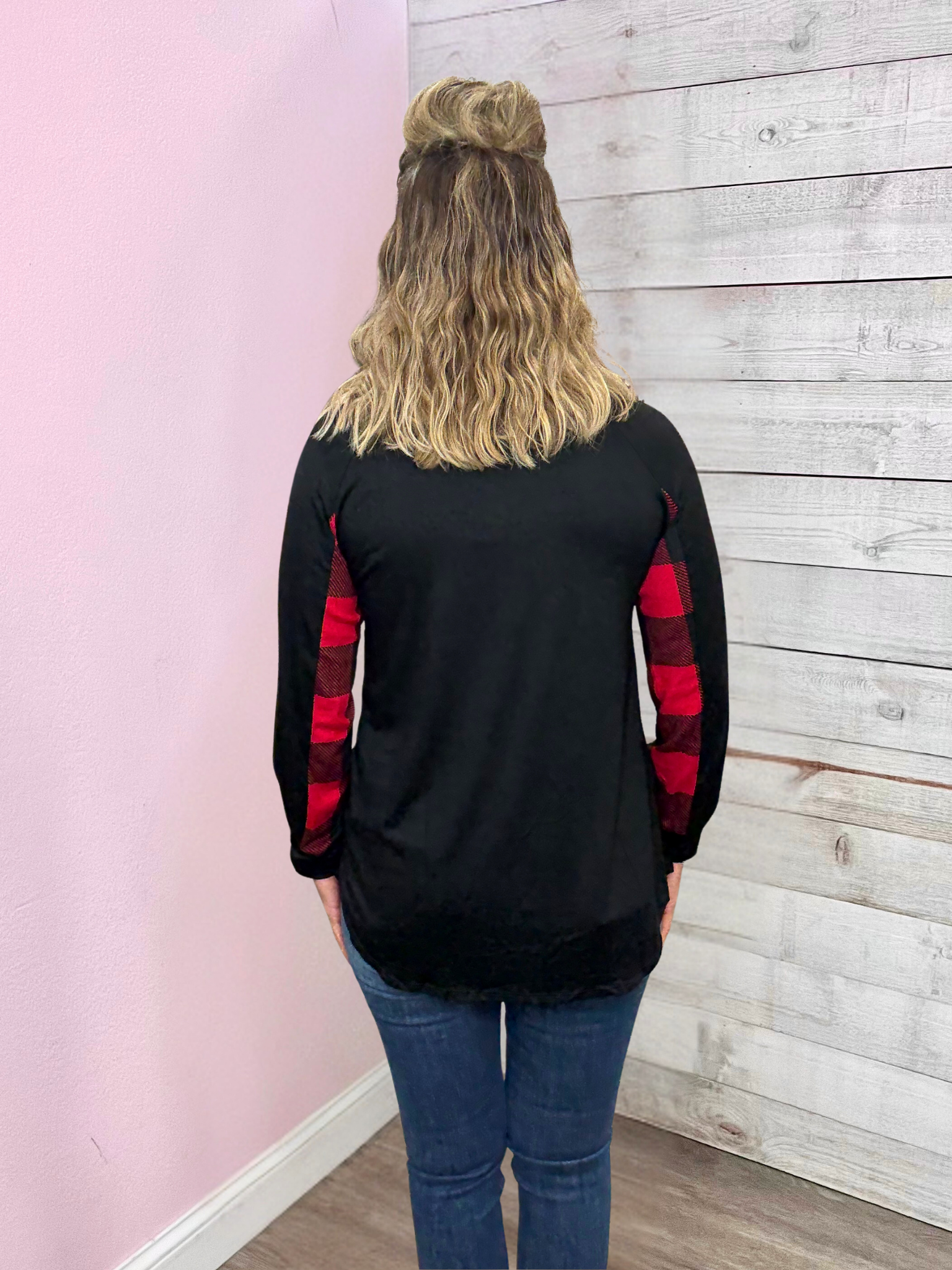Black top with plaid contrast featuring a round neckline, long sleeves, and a dolphin hemline.