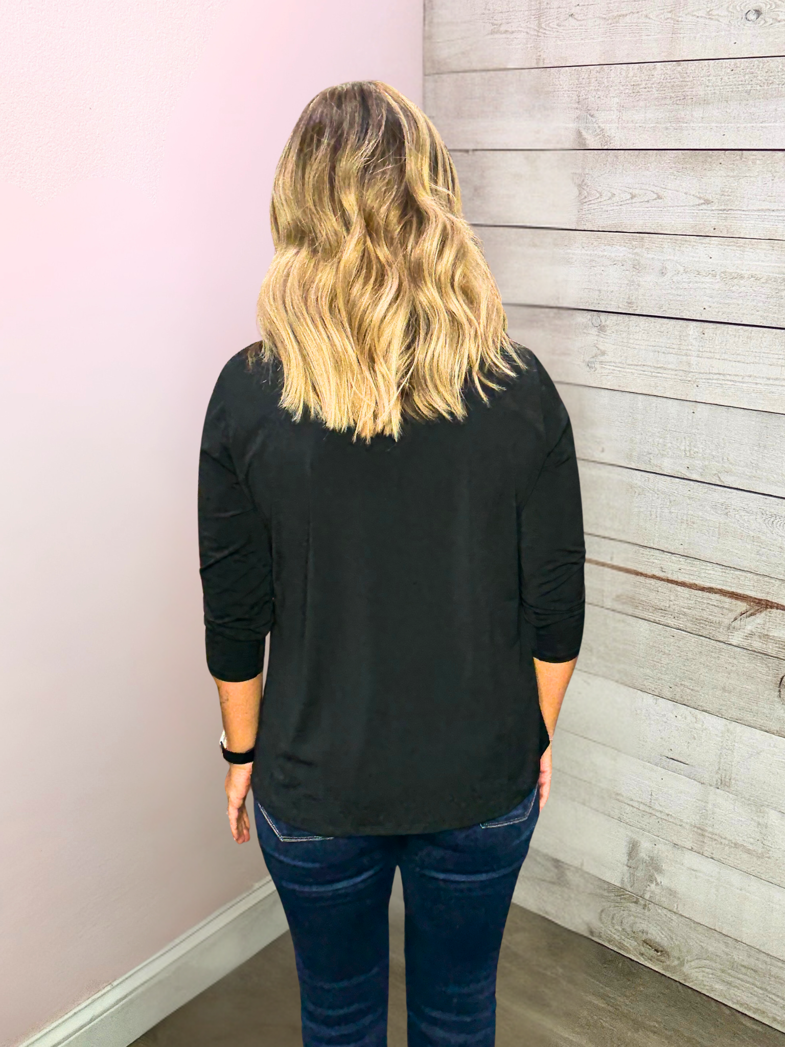 Classic solid top featuring a V neckline, 3/4" sleeves, and a straight hemline. Non-sheer, stretchy wrinkle free fabric.