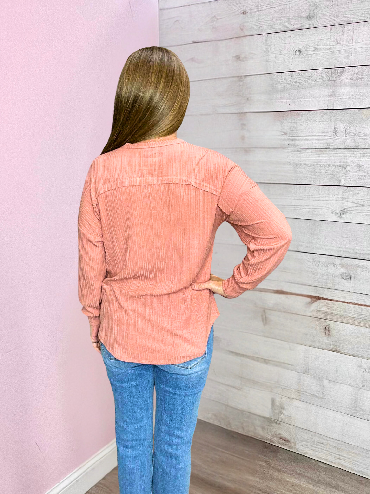 Mauve soft ribbed top featuring a round neckline with functional buttons, long sleeves, and a curved hemline. True to size!